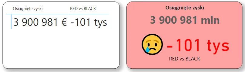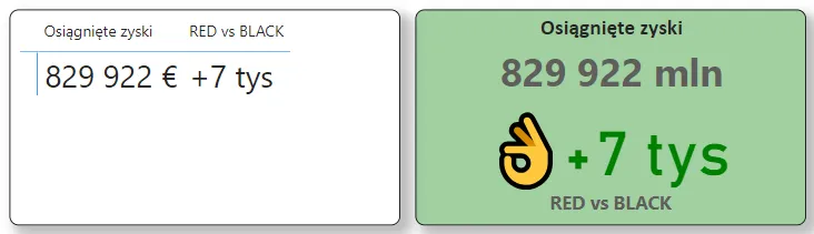 Aby jeszcze bardziej rozbudować wizualizację warto używać sterowania kolorami. Z reguły zielony = wzrost, czerwony = spadek. Kolory takie jednoznacznie symbolizują co się dzieje w naszych raportach.