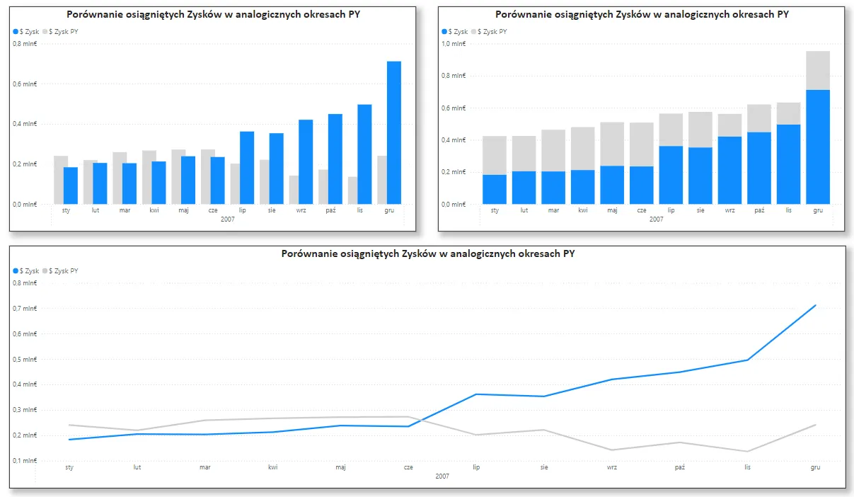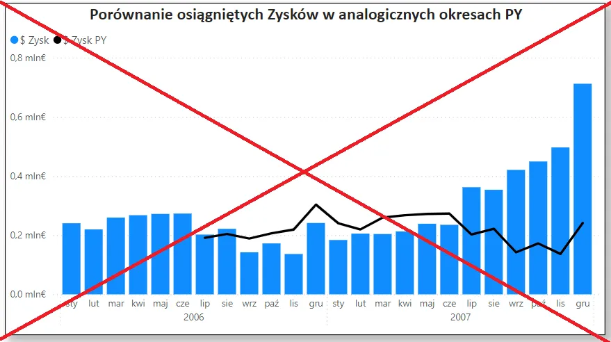 Jeśli coś jest tym samym wymiarem powinno być zaprezentowane w taki sam sposób. Oznacza to, że jeśli pokazuje te przykładowe zyski to zawsze albo na linii albo na słupku czy kolumnie. Bardzo źle zaprezentowane są dane poniżej gdzie pokazałem ten sam wymiar na wykresie kombi. Wprowadza to błędne przekonanie, że to jest co innego.