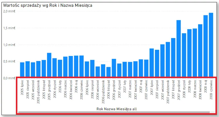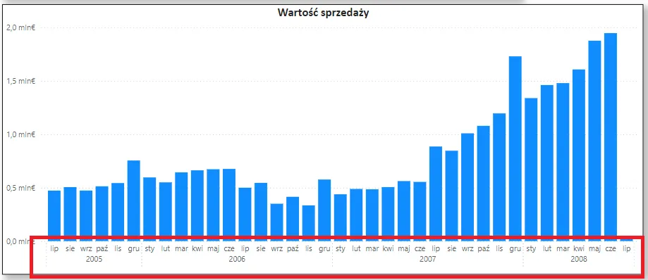 Spójrzcie na dwa wykresy poniżej skupiając swoją uwagę na osi X. Czy na pierwszym wykresie czujecie się trochę przytłoczeni informacjami? Zostały tam wiele razy powtórzone te same informację dotyczące roku i miesiąca. Na drugim wykresie też ale w sposób bardziej rozsądny. Mała zmiana ale jak bardzo wpływa na odbiór prawda?
