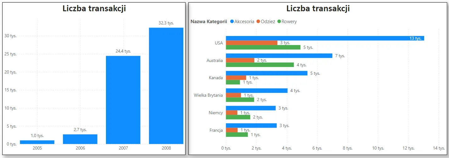 Przyjrzyjcie się uważnie wykresom kolumnowym. Widzicie pewną subtelną różnicę? Tak! Chodzi o legendę. Warto budować tak wizualizację aby dane były dla ludzkiego oka naturalnie widoczne. Na pierwszym wykresie kolumnowym legenda jest na dole a więc odbiorca najpierw wzrokiem „przeskanował” dane a później przeczytał legendę co one oznaczają. Na wykresie obok już jest lepiej bo legendę umieściłem na górze więc wręcz wymusiłem na użytkowniku aby zapoznał się co dany kolor oznacza i dopiero później zaczął analizować dane.