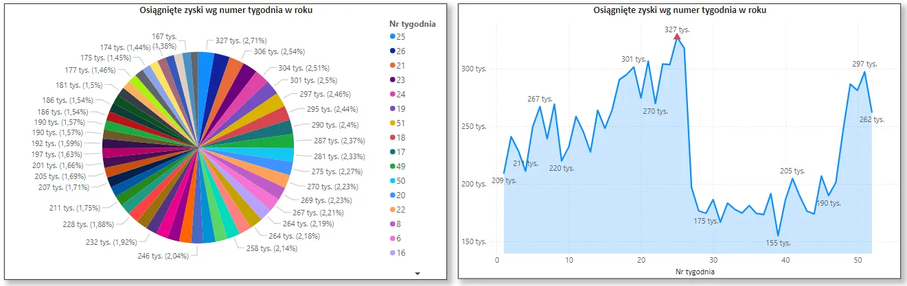 Przykład poniżej gdzie potrzebuje pokazać wyniki sprzedażowe dla numerów tygodnia w roku. Jest ich wiele więc wykres kołowy wygląda dramatycznie. Dobrym rozwiązaniem jest skorzystanie np. z wykresu liniowego gdzie dane są czytelne i przyjazne dla użytkownika.