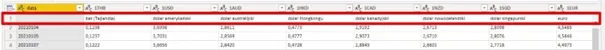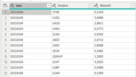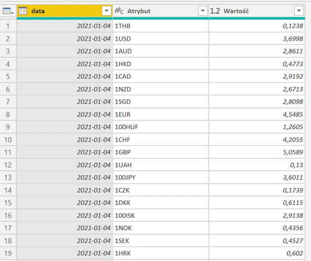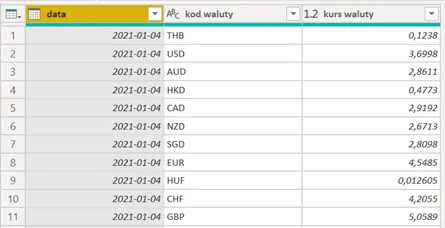 4. Dane ułożone są tak, że każda waluta ma dla siebie oddzielną kolumnę, co nie jest najwygodniejszym sposobem przechowywania danych w Power BI czy też w Excelu. Zdecydowanie wygodniej byłoby pracować z taką tabelą, gdyby miała układ zgodny z poniższym: