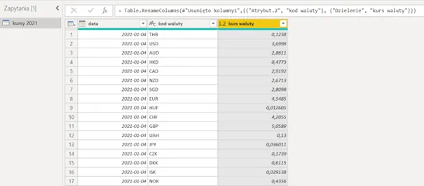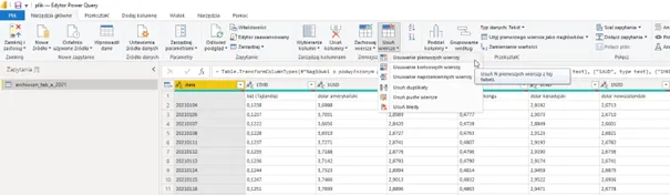 Jak widzimy, jest sporo problemów, które należy naprawić przed wczytaniem danych do Power BI. Pozytywne jest to, że wykorzystując Power Query (niezależnie czy w Power BI czy w Excelu) takie czynności (naprawy) wykonamy tylko 1 raz. Potem będziemy tylko odświeżać nasze zapytanie (gdy pojawią się bardziej aktualne kursy, a Power Query sam będzie szedł do strony nbp.pl i wykonywał wszystkie te działania. Zacznijmy zatem naprawy.