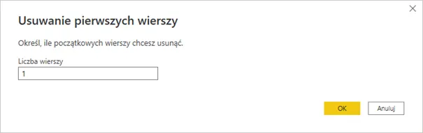 Po wybraniu tej opcji należy wskazać ile wierszy z widocznego na danym etapie (tym samym dostępnego) datasetu należy usunąć. W naszym konkretnym przypadku pobierania kursów walut z nbp.pl jest to jeden wiersz: