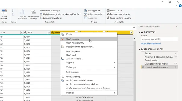 … oraz posprzątanie 😊 – usuwamy więc, niepotrzebne kolumny, zmieniamy ich nazwy a także nazwę zapytania.