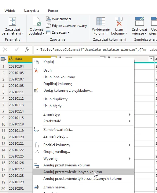 Klikamy zatem na pierwszą kolumnę z Datą prawym przyciskiem myszy i wybieramy polecenie Anuluj przestawienie innych kolumn.
