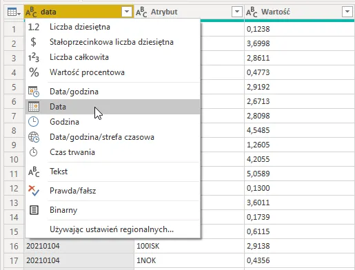Musimy zaopiekować się datami oraz liczbami. W pierwszej kolejności klikamy w ikonę wyróżnika typu w kolumnie z datą i wybieramy Data: