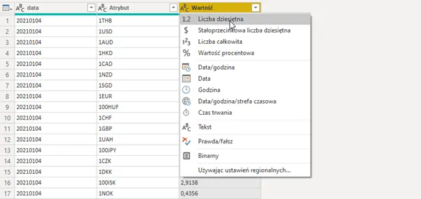 W kolejnym kroku klikamy ikonę typu w nagłówku Wartość i wybieramy Liczba dziesiętna.