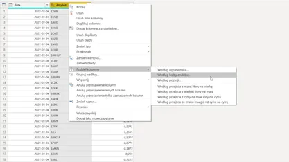 - Podział kolumny o obecnej nazwie „Atrybut” tak, aby w jednej kolumnie uzyskać liczbę jednostek, w drugiej zaś nazwę kodu waluty,