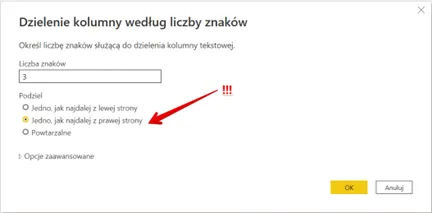 Wiedząc, że kod waluty jest zawsze 3-znakowy (np. PLN, USD, EUR) możemy wskazać, że interesuje nas przecięcie kolumny przed ostatnimi 3 znakami w komórce. Wskaż opcje jak na poniższym zrzucie, czyli: