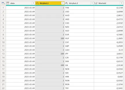 W tym kroku interesuje nas sprowadzenie danych do postaci, w której jedna kolumna będzie zawierać datę, druga nazwę waluty (z nagłówka), a trzecia wartość.