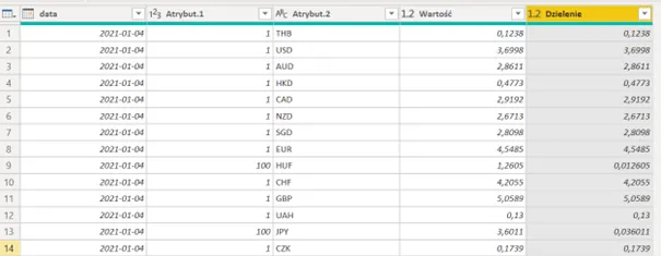- Podzielenie kursu (kolumna Wartość) przez liczbę jednostek waluty (która dopiero powstanie 😊).
