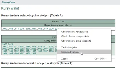Podczas pisania tego artykułu najbardziej aktualnym plikiem jest plik za rok 2021. W pierwszej kolejności należy pozyskać bezpośredni tekst hiperłącza. Najłatwiej to wykonać klikając prawym przyciskiem myszy na numer roku w sekcji „Format CSV” i wybierając polecenie Kopiuj adres linku.