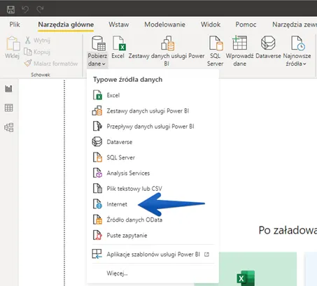 Kolejnym krokiem będzie przerzucenie odnośnika do narzędzia, gdzie chcemy mieć dostępne dane (Excel/Power BI). W Power BI należy w grupie Pobierz dane wskazać Internet. Kuszące może być wskazanie opcji Plik tekstowy lub CSV, jednak dla nas (a raczej dla Power BI 😊 ) ważniejsze jest to, że należy przemieścić się do sieci www i tam będzie w stanie rozpoznać do czego konkretnie się podłączamy (plik HTML czy np. csv)