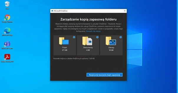 W pierwszym kroku należy zalogować się do OneDrive z komputera na którym ma być zapisana kopia dokumentów. Należy to zrobić z poziomu komputera, klikając z ikonę chmurki na dolnym pasku pulpitu. Następnie należy przejść do ustawień klikając prawym przyciskiem myszy na ikonę chmury. W ramach tych ustawień w opcji KOPIA ZAPASOWA pojawi się możliwość ZARZĄDZANIA KOPIĄ ZAPASOWĄ. W kolejnym kroku pojawi się okno z możliwość backupu pulpitu, dokumentów lub obrazu wraz z informacją ile ważą dane foldery. Po wybraniu odpowiednych należy kliknąć ROZPOCZNIJ TWORZENIE KOPII ZAPASOWEJ. Czas tworzenia kopii będzie uzależniony od wagi folderów, dlatego warto rozważyć tworzenie kopii wieczorem, jeżeli ilość danych jest odpowiednio duża.