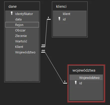 Poprzednie przykłady miały jeden haczyk – zakładały, że wszystkie informacje leżą grzecznie w jednej, „płaskiej” tabeli, niczym w prostym arkuszu kalkulacyjnym. W prawdziwym świecie systemów biznesowych bazy danych tak nie wyglądają. Opierają się na relacjach. Klienci mają swoją tabelę, województwa swoją, a konkretne pozycje na fakturze jeszcze inną. Takie rozbicie danych gwarantuje porządek, ale jak z tego gąszczu wyciągnąć spójne wnioski?