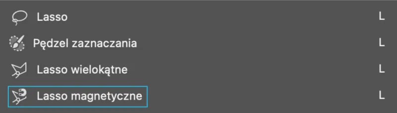 Kolejnym narzędziem jest Magnetic Lasso (Lasso magnetyczne) to sprytny pomocnik – śledzi ruch myszy i automatycznie „przyczepia” się do krawędzi kształtu, który masz pod kursorem, precyzyjnie obrysowując ścieżkę. Jeśli coś nie wyjdzie idealnie, tak jak w przypadku Lassa wielokątnego, wystarczy nacisnąć klawisz backspace lub delete, aby cofnąć ostatnie punkty i poprawić zaznaczenie.