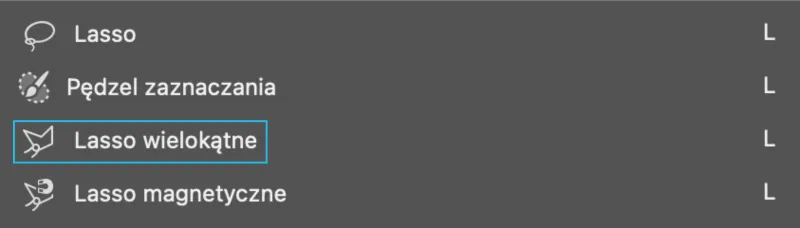 Inną odmianą Lassa jest Polygonal Lasso (Lasso wielokątne). Pozwala ono zaznaczyć interesujący nas obszar, poprzez wyznaczanie linii prostych, które utworzą kolejne kształty. Gdy linia nie wyszła Ci idealnie, wystarczy nacisnąć klawisz backspace lub delete, aby cofnąć ostatni punkt i spróbować ponownie.