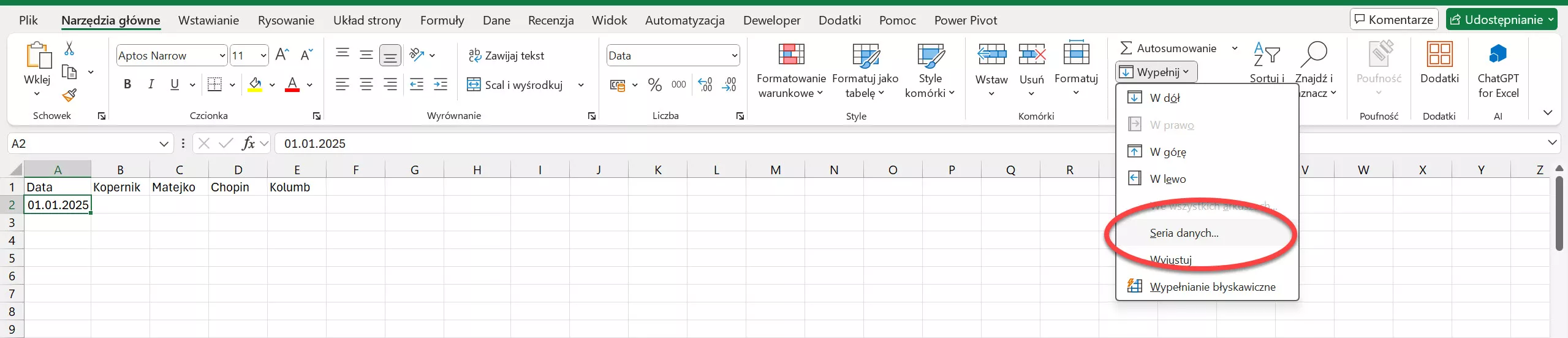 W arkuszu tym musisz uzupełniać sprzedaż uzyskaną przez poszczególnych handlowców w kolejnych dniach roku. Dlatego będziesz potrzebować w kolejnych wierszach kolumny A wygenerować sobie kolejne daty aż do 31.12.2025. Aby to uzyskać ustaw się na komórce A2, a następnie na wstążce na karcie Narzędzia główne wybierz narzędzie Wypełnij, a później Seria danych.