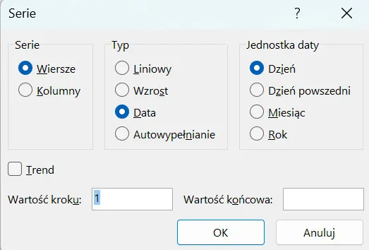Wybór parametrów wypełniania serią danych w Excelu