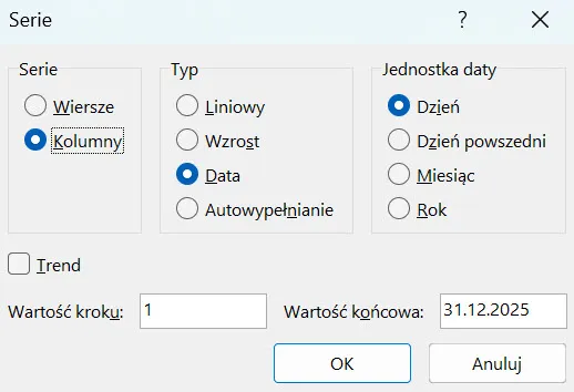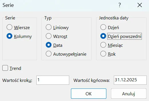 W dolnej części okna natomiast możesz wybrać, jaka ma być wartość kroku, czyli o ile zaznaczonych przed chwilą jednostek mają się kolejne daty od siebie różnić. W Twoim przypadku powinna tu zostać wartość 1. Ostatnią rzeczą, którą musisz w tym okienku wskazać jest wartość końcowa, czyli do jakiej daty chcesz wygenerować kolejne wartości. W Twoim przypadku będzie to wartość 31.12.2025.