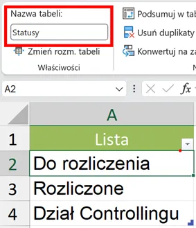 Dlaczego to jest genialne? Od teraz, kiedy tylko dopiszemy nową wartość w tabeli Statusy („Brak akceptacji”), nasz lista rozwijana zaktualizuje się sama. Koniec z ręcznym poprawianiem zakresów!