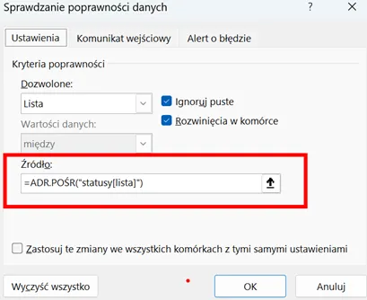 - Wykorzystaj funkcję POŚR: Excel ma pewne ograniczenie – w oknie Poprawność danych nie można bezpośrednio wpisać nazwy tabeli (np. =Statusy[Lista]). Aby to obejść, używamy małego triku z funkcją ADR.POŚR wpisując w Źródle: