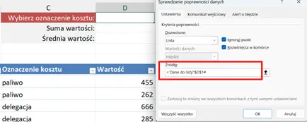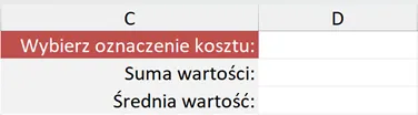Jeśli korzystamy z Microsoft 365, możemy stworzyć listę, która sama wybierze unikalne wartości z długiego zestawu danych. To idealne rozwiązanie, gdy chcemy stworzyć panel analityczny, w którym po wyborze konkretnego kosztu, Excel automatycznie wyliczy jego sumę oraz średnią: