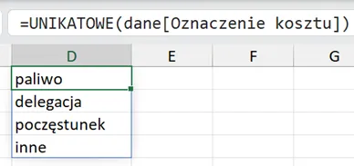 =UNIKATOWE(dane[Oznaczenie kosztu])