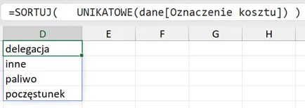 =SORTUJ( UNIKATOWE(dane[Oznaczenie kosztu])