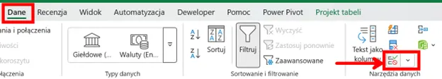 - Z karty Dane na górnej wstążce, wybieramy ikonę Poprawność danych (w sekcji Narzędzia danych):