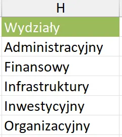 - Wpisy główne: Najpierw tworzymy listę unikatowych wydziałów. W komórce H2 wpiszemy formułę: