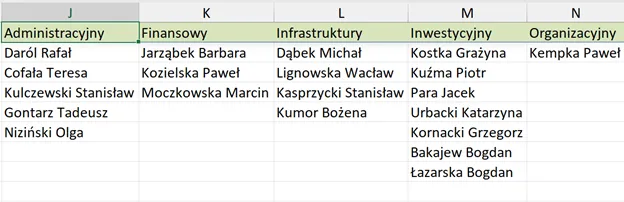 - Przypisanie pracowników do wydziałów: Teraz pod każdym nagłówkiem (wydziałem) wpiszemy odpowiednich pracowników. Aby Excel wiedział, który pracownik należy do którego wydziału, musimy nadać tym zakresom nazwy.