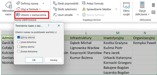 - Z karty Formuły wybieramy Utwórz z zaznaczenia.
