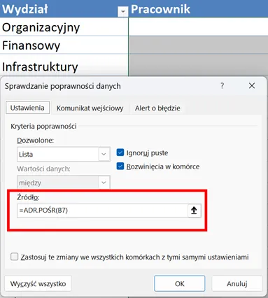 Jak to działa? Funkcja ADR.POŚR (ang. INDIRECT) tłumaczy tekst wybrany w pierwszej liście na „zrozumiały” dla Excela adres zakresu. Jeśli w komórce B7 jest wydział „Organizacyjny”, funkcja powie Excelowi: „Hej, pobierz dane z zakresu, który nazywa się Organizacyjny”. To takie proste!