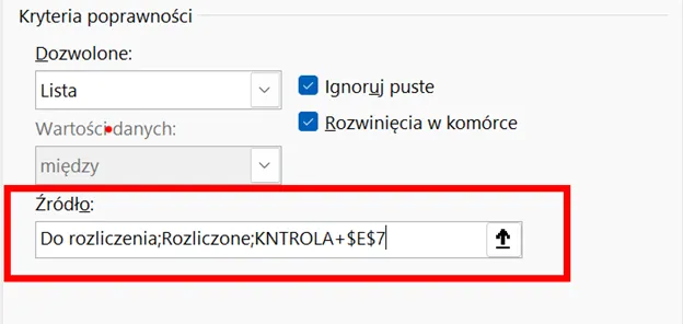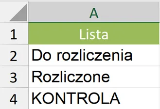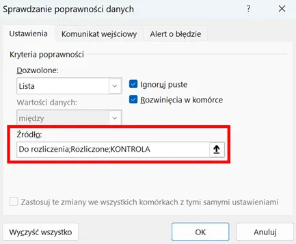 - W oknie, które się pojawi, w polu Dozwolone, wybieramy Lista, a w polu Źródło wpisujemy swoje opcje, oddzielając je średnikiem (Do rozliczenia;Rozliczone;KONTROLA).