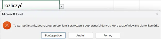Ważna uwaga: Narzędzie poprawności danych nie działa wstecz. Oznacza to, że jeśli nałożymy listę wyboru na komórki, które są już wypełnione (np. „check”), Excel nie zasygnalizuje błędu w istniejących wpisach. Będziemy musieli zweryfikować je ręcznie lub skorzystać z opcji zakreślania błędów.