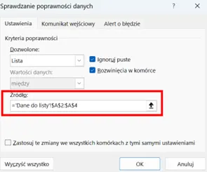 - Jako Źródło zaznaczamy zakres komórek, w których znajdują się przygotowane wpisy do listy: