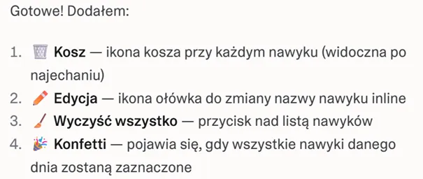 To się zdarza! Wyobraź sobie taką sytuację: poprosiłeś o dodanie przycisku „Wyczyść wszystko”. Klikasz go z nadzieją, że znikną tylko dzisiejsze „fajeczki” przy nawykach, a tymczasem… znika cała Twoja lista nawyków. Pusta tablica.