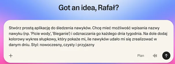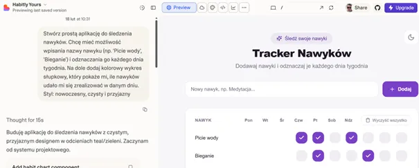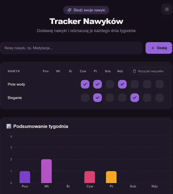 „Stwórz prostą aplikację do śledzenia nawyków. Chcę mieć możliwość wpisania nazwy nawyku (np. 'Picie wody’, 'Bieganie’) i odznaczania go każdego dnia tygodnia. Na dole dodaj kolorowy wykres słupkowy, który pokaże mi, ile nawyków udało mi się zrealizować w danym dniu. Styl: nowoczesny, czysty i przyjazny.”