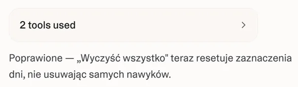 „Zachowanie przycisku 'Wyczyść wszystko’ nie jest zgodne z moimi oczekiwaniami – obecnie usuwa on całą listę nawyków. Popraw to: przycisk ma usuwać tylko zaznaczenia dni tygodnia (resetować postęp), a same nawyki mają zostać na liście.”