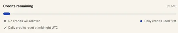 - W planie darmowym: Masz do dyspozycji 5 kredytów dziennie. To „paliwo” na start – wystarczy na szybkie testy lub wprowadzanie drobnych poprawek. Co ważne, limit ten odnawia się automatycznie każdego dnia o północy, więc następnego dnia znów możesz działać.