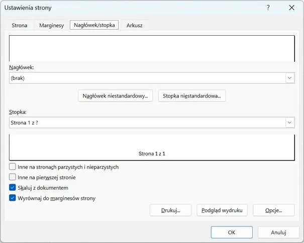 Ustawić automatyczne nagłówki i stopki.