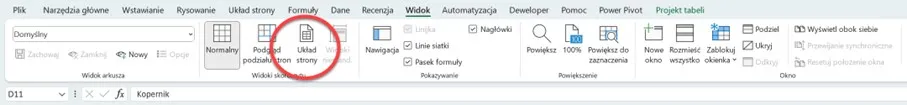 Aby dodać nagłówek i/lub stopkę do wydruku wystarczy, że wejdziesz na wstążce w kartę Widok i wybierzesz narzędzie Układ strony, które pokazuje Rysunek 2.