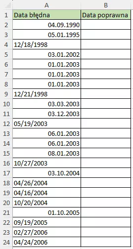- W kolejnych wierszach wpisz poprawną wartość dla nietypowego przypadku, np. w komórce B4 wpisz 18.12.1998, jeśli w A4 dzień i miesiąc są zamienione miejscami.