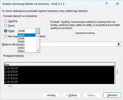 - W sekcji Format danych w kolumnie wybierz opcję Data, a z rozwijanej listy wskaż odpowiedni układ – w tym przykładzie MDR (miesiąc-dzień-rok), czyli taki, jaki odpowiada aktualnemu zapisowi daty Rys. 2).