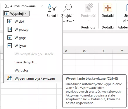 - Ustaw kursor w pustej komórce kolumny z poprawionymi datami (np. B5) i wybierz Narzędzia główne 🠒Wypełnij 🠒 Wypełnianie błyskawiczne (Rys. 3).