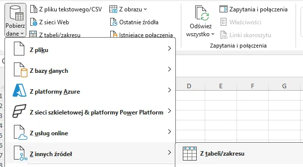 - Na karcie Dane wybierz Pobierz dane 🠒 Z innych źródeł 🠒 Z tabeli/zakresu (Rys. 4).