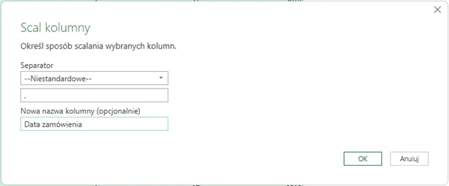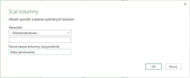- W oknie scalania ustaw separator Niestandardowy i wpisz kropkę (.). Od razu nadaj nowej kolumnie nazwę Data zamówienia i zatwierdź (Rys. 5).