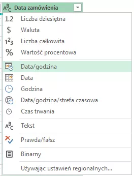 - Obok nazwy nowej kolumny kliknij w ikonę typu danych („ABC”) i wybierz odpowiedni typ daty (Rys. 6).